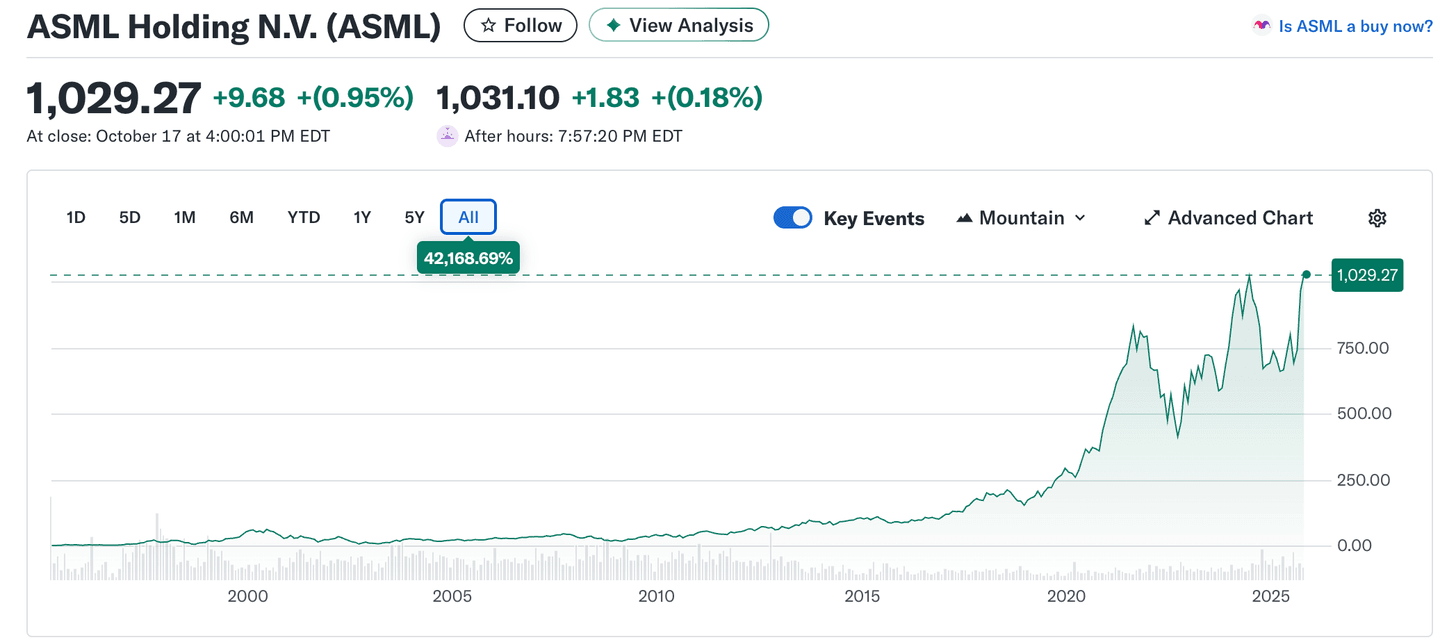 - Akcie ASML nedávno dosáhly nového historického maxima na úrovni přibližně 1 030 USD, čímž překonaly předchozí vrcholy a potvrdily ukončení předchozí korekce. Tento průraz může být interpretován jako býčí signál s potenciálem dalšího růstu. Dlouhodobý trend zůstává silně rostoucí – za poslední dvě dekády zhodnotila společnost o více než 42 000 %. Zvýšený objem a stabilní fundamenty dále podporují pozitivní výhled do budoucna.