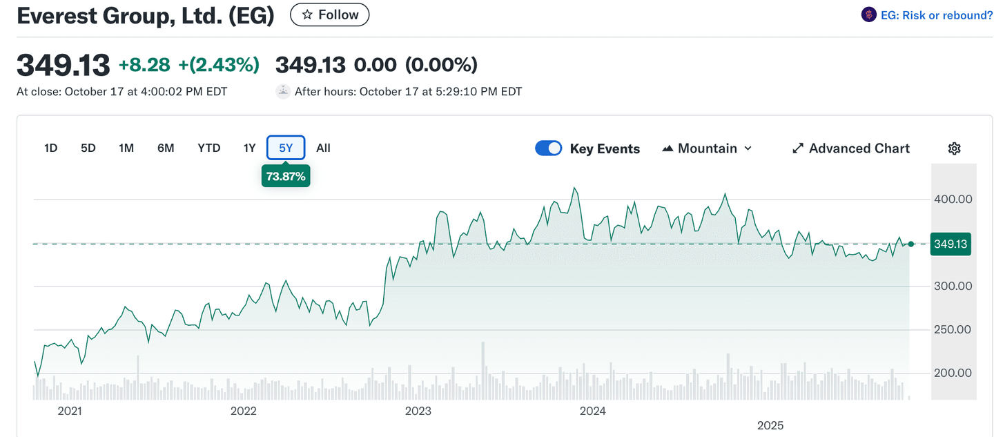 - Cena akcií Everest Group se aktuálně pohybuje kolem 349 USD, což je blízko horní hranice postranního kanálu, ve kterém se titul držel většinu posledních dvou let. Přestože růst není přímočarý, celková výkonnost za posledních 5 let činí +73,87 %, což ukazuje na dlouhodobý potenciál. Pokud by cena prorazila úroveň rezistence s dostatečným objemem, mohlo by to signalizovat nový růstový trend.