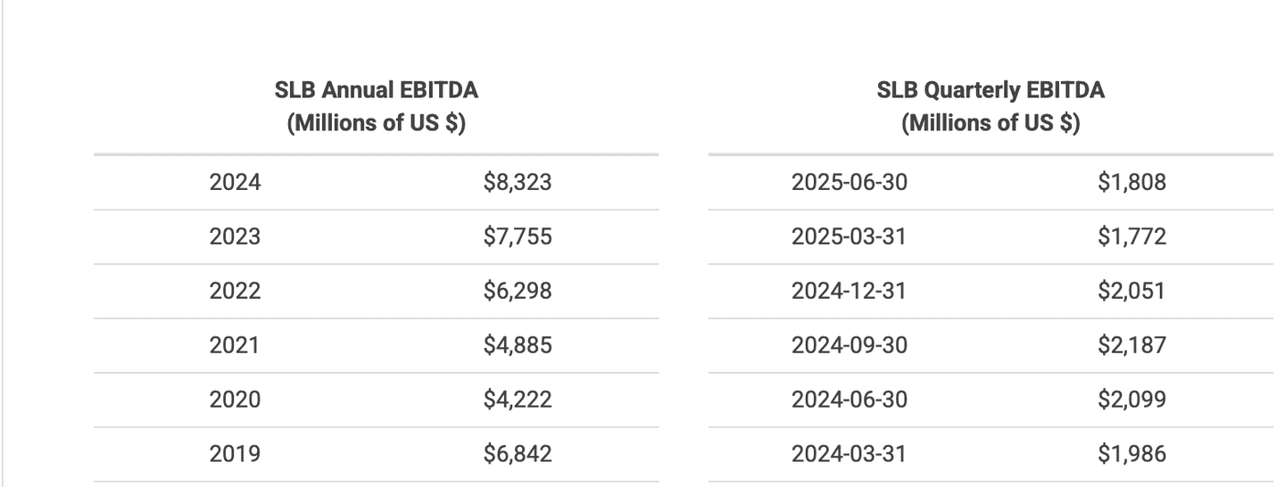 - Společnost SLB vykazuje od roku 2020 konzistentní růst EBITDA, který z $4,222 mil. USD v roce 2020 vzrostl na $8,323 mil. USD v roce 2024 – což představuje téměř dvojnásobný růst během čtyř let. Na kvartální bázi ale došlo ve 1H 2025 k mírnému zpomalení růstu (Q2: $1,808 mil., Q1: $1,772 mil.) oproti silnějším výsledkům ve 2H 2024 (např. Q3: $2,187 mil.). Přesto však úroveň EBITDA zůstává výrazně nad úrovní předchozích let, což podtrhuje silnou výkonnost firmy i v prostředí cenové a energetické nejistoty. Tento vývoj signalizuje, že SLB nadále těží ze silné poptávky po energetických službách, i když růstový moment se může dočasně stabilizovat.