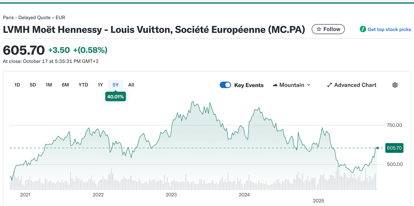 - Akcie LVMH dosáhly v červenci 2023 vrcholu nad 860 EUR, ale následně prošly výraznou korekcí, která je v první polovině roku 2025 poslala až pod hranici 500 EUR. Aktuálně se obchodují kolem 605 EUR a od lokálního minima vykazují jasné známky obratu. Tento vývoj může signalizovat vytvoření dvojitého dna nebo návrat k růstovému trendu. Zvýšený nákupní objem naznačuje obnovený zájem investorů, pravděpodobně v očekávání oživení poptávky v Číně a luxusním segmentu obecně. Pokud dojde k prolomení rezistence kolem 650 EUR, může být potvrzen nový růstový impuls.