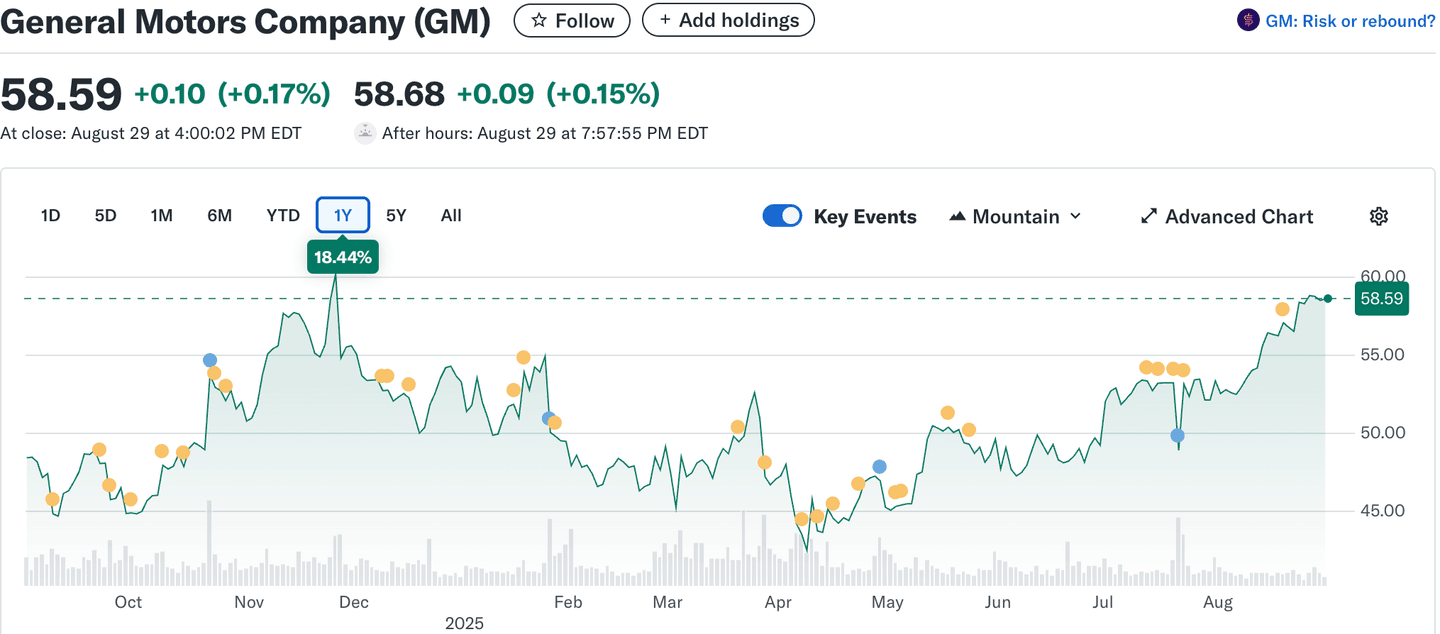 GM akcie se tradičně považují za stabilní investici s mírně rostoucím trendem. V roce 2020 a 2021 zažily růst díky plánům na expanzi v oblasti elektromobilů, přičemž dosáhly maxima kolem 65 USD.
