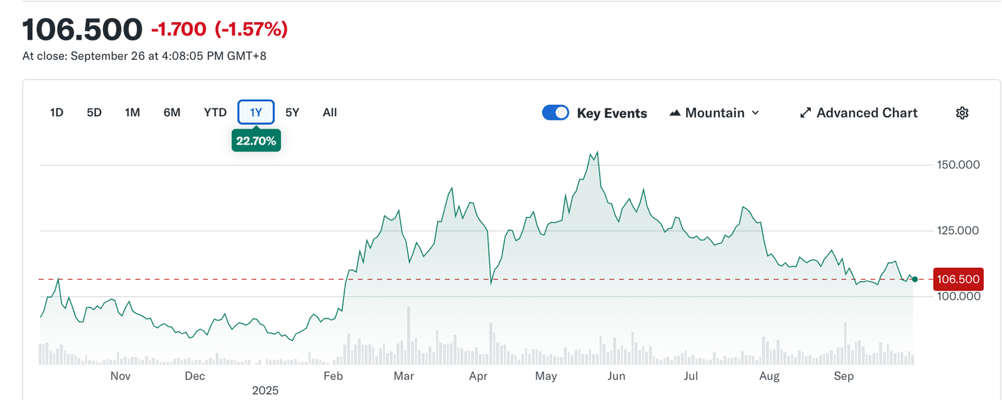 Akcie BYD během roku 2025 zažily bouřlivý vývoj. Nejprve prudce rostly, dosáhly historických maxim, ale následně prošly korekcí až na aktuální úroveň kolem HKD 106,50.