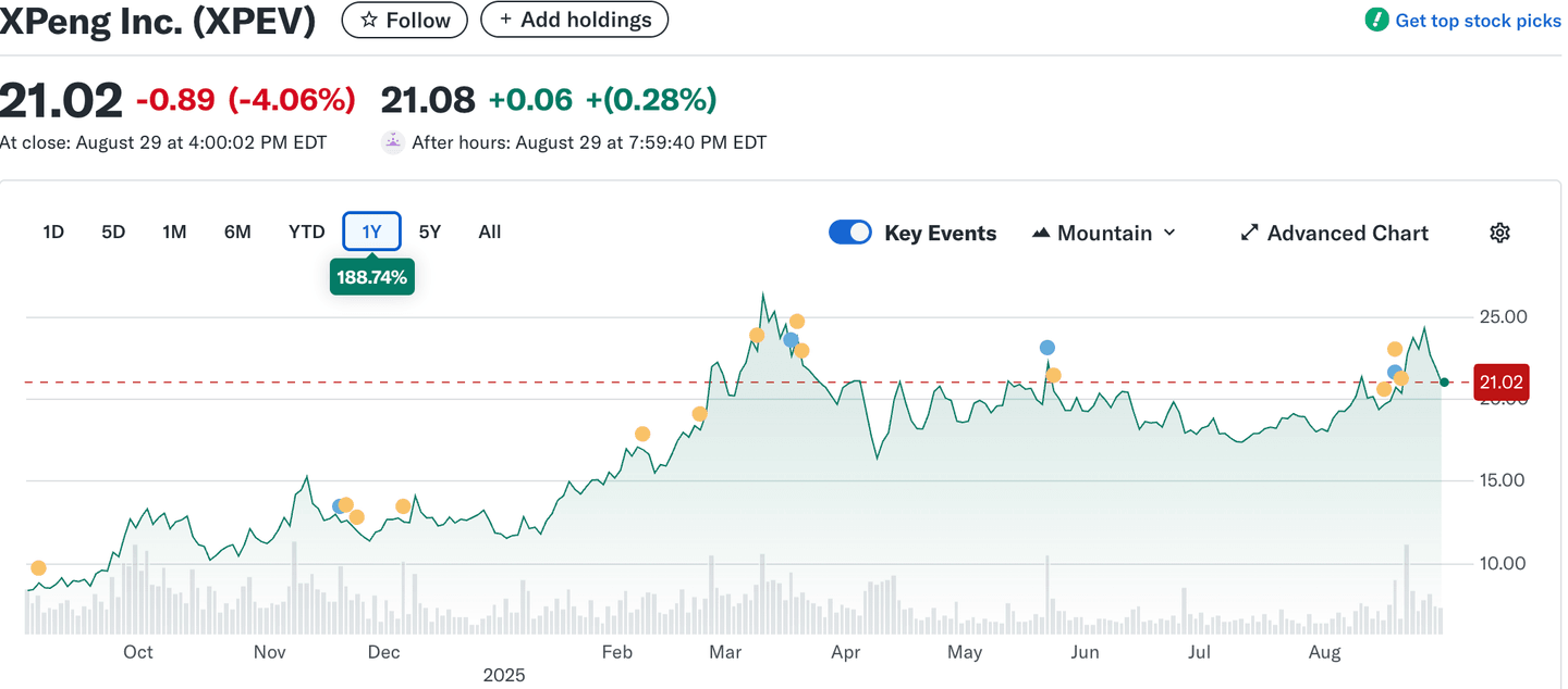 Podobně jako ostatní čínské EV společnosti však akcie XPeng čelily silné volatilitě. Regulační zásahy čínské vlády v roce 2021 a globální ekonomická nejistota vedly k poklesu ceny akcií až na 10–15 USD v roce 2022.