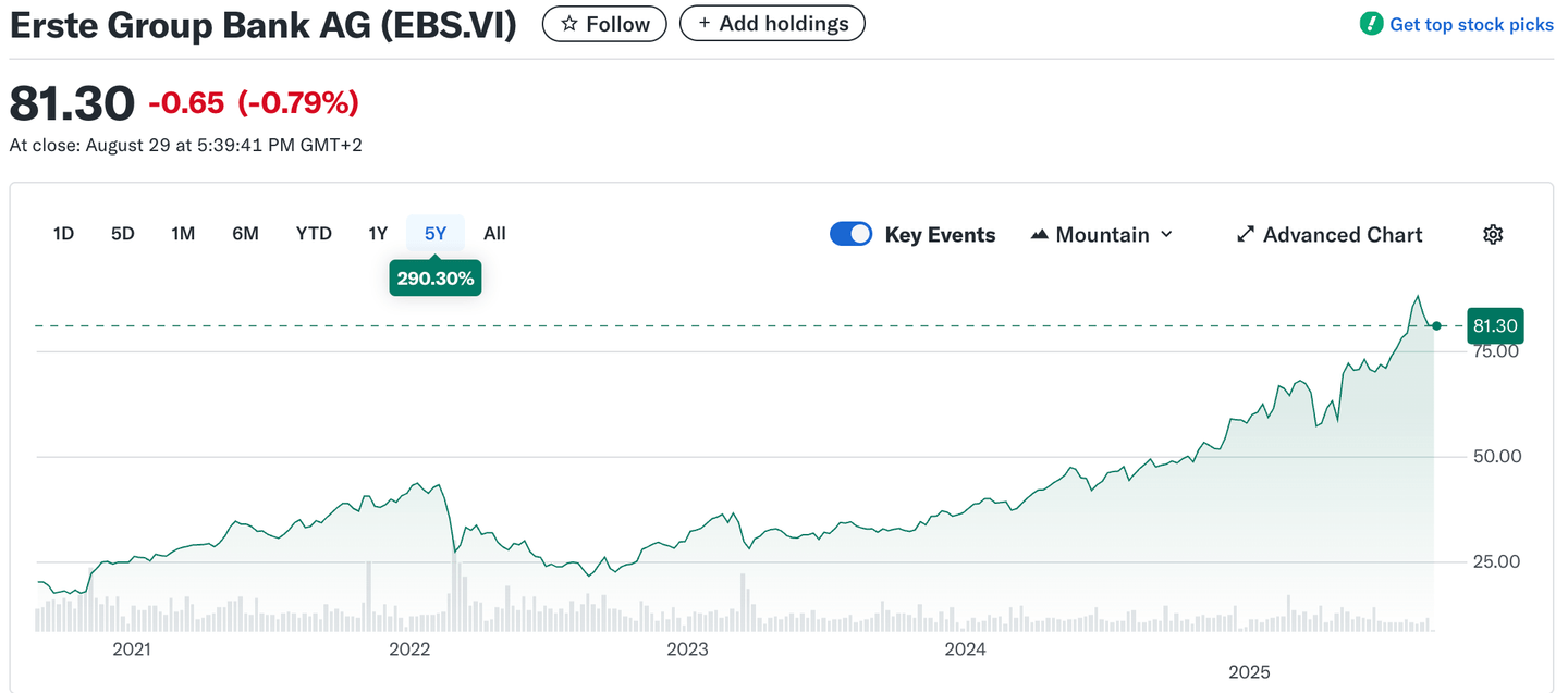 Erste akcie byly dlouhodobě stabilní investicí s růstovým potenciálem. Po finanční krizi v roce 2008 prošla banka restrukturalizací, která vedla k postupnému růstu akcií.
