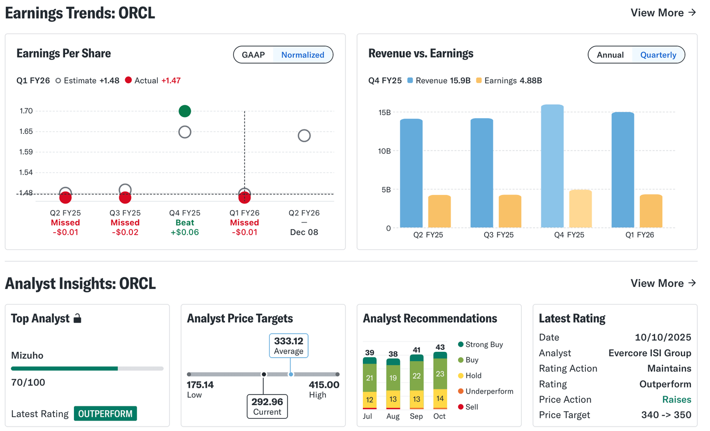 Analytici zůstávají ve vztahu k Oracle vesměs pozitivní. Průměrná cílová cena se aktuálně pohybuje kolem 333 USD, přičemž horní odhad dosahuje až 415 USD. Nejnovější rating z 10. října 2025 vydaný Evercore ISI Group zachovává hodnocení „Outperform“ a zároveň zvyšuje cílovou cenu z 340 na 350 USD. To naznačuje důvěru analytiků v další růst firmy. Z celkem 43 aktuálních doporučení hodnotí 23 analytiků akcii jako „Buy“, dalších 6 ji považuje za „Strong Buy“ a pouze 14 analytiků volí konzervativní „Hold“. Téměř žádná doporučení nesměřují k prodeji, což ukazuje na převládající optimismus.