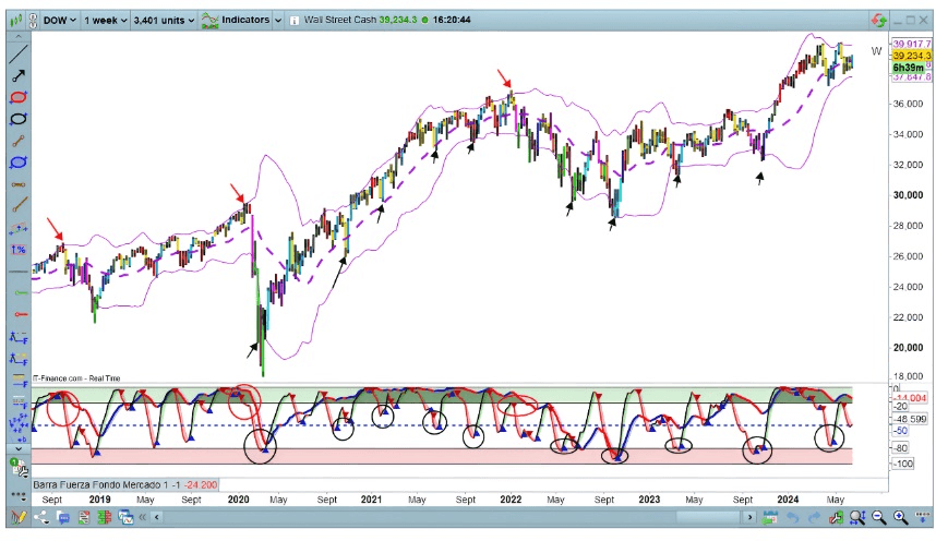 Pokud přidáme pásma s 2 DE, vidíme, jak zatímco se cena drží uvnitř pásem, vývoj trendu je jednoduchý, při každém impulsu dosáhne a testuje odpovídající pásmo, a když kvůli nadměrné volatilitě překročí nebo „prolomí“ pásmo, následující pohyb je korekce, menší nebo větší, ale významná korekce nebo obrat trhu.