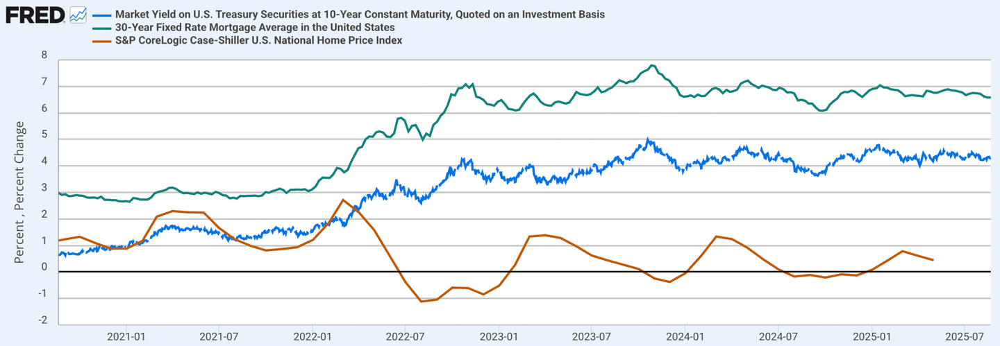 Pokud by teď náhle přišel příliv poptávky, výnos z dluhopisů klesne – přesně to, o co usiluje Trumpova administrativa. No, a zatím lze říct, že toho dosáhla jen minimálně, protože výnos desetiletého amerického státního dluhopisu za poslední dva měsíce klesl jen o 10 %. Dá se říct, že je to alespoň něco, ale rozhodně ne dost. A v létě 2025 se navíc situace začala stabilizovat, což Trumpovi nehraje do karet.