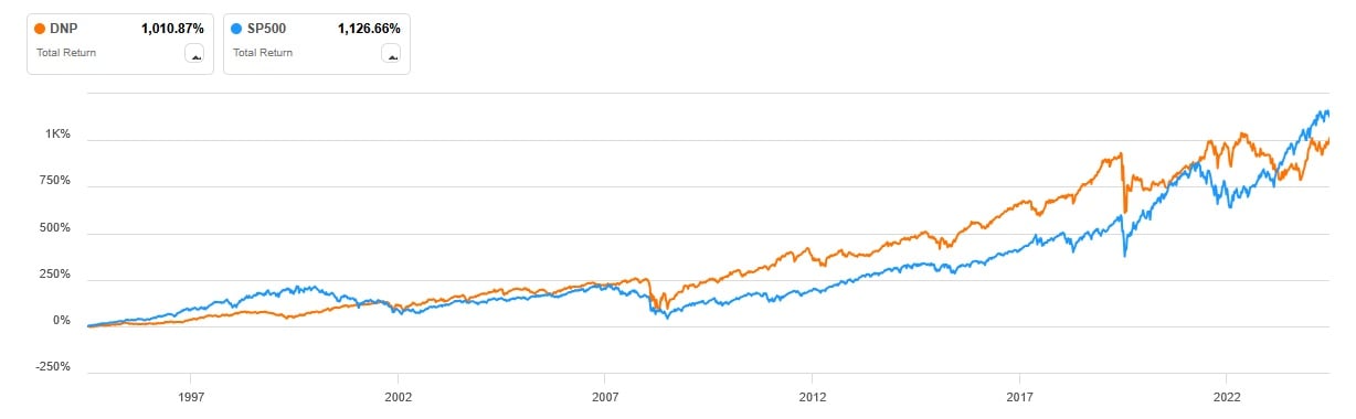 Sleduji fondy, jejichž cena se v čase pohybovala v určitém stabilním rozmezí. Například pokud se podíváme na DNP Select Income Fund, vidíme, že jeho cena se historicky držela v relativně úzkém pásmu.