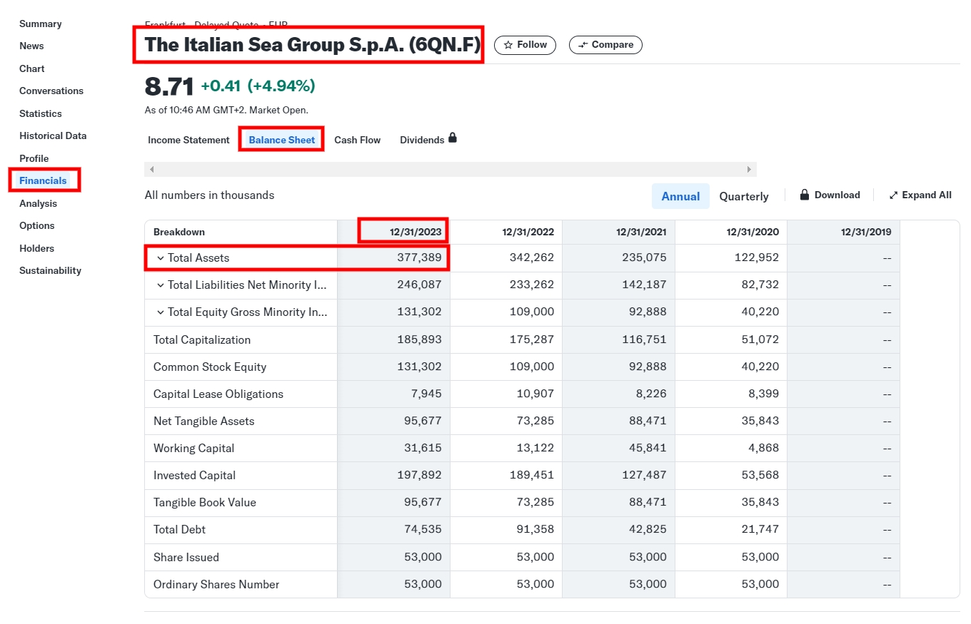 Již máme celková aktiva (pod Total Assets) The Italian Sea Group, která činila 377,39 milionů eur.