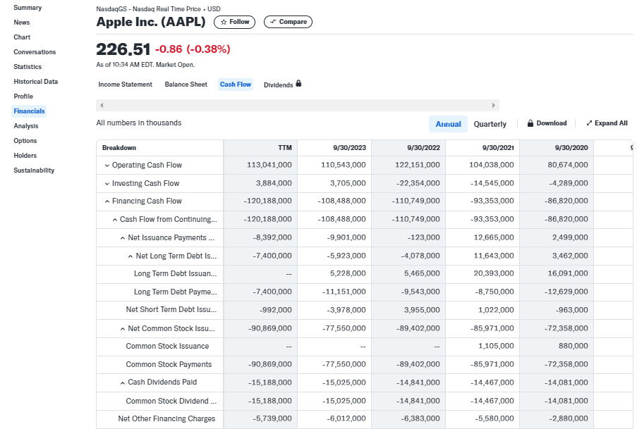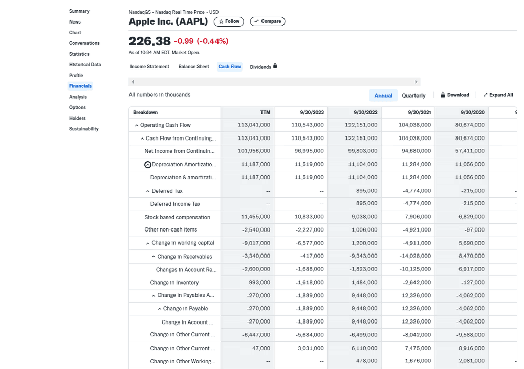 Většina velkých společností sestavuje výkaz peněžních toků nepřímou metodou. Proto se bude analyzovat tato metoda s odkazem na výkaz peněžních toků společnosti Apple.