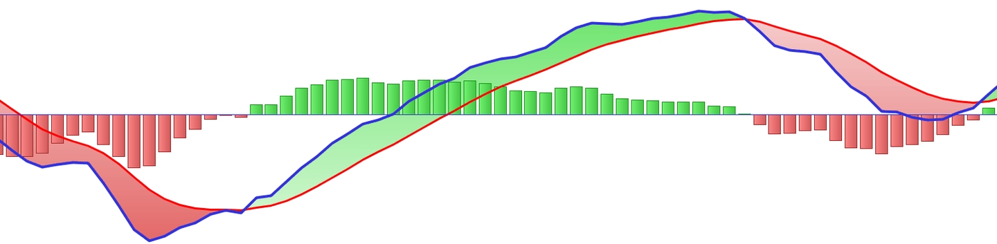 Vypočítává se odečtením exponenciálního klouzavého průměru (EMA) 26 období od EMA 12 období, čímž se vytvoří MACD linie, která se porovnává se signální linií, což je EMA 9 období MACD.