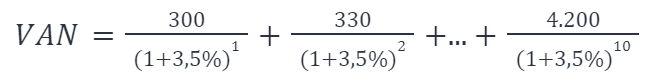 Terminální hodnota v roce 10 je 4,200 EUR, která bude diskontována od tohoto období. To znamená, že výpočet by byl následující: