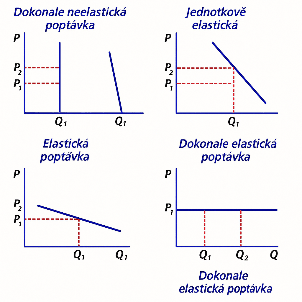 Dokonale neelastická: Elasticita je rovna nule. Poptávané množství je pevné a nemění se při změnách ceny.