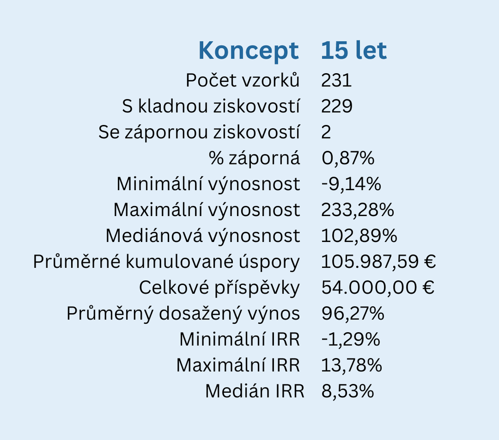 Pokud půjdeme na 15 let, pravděpodobnost ztráty je téměř 0. Méně než 1 % vzorků má ztrátu a v nejhorším případě je ztráta -9,14 %.