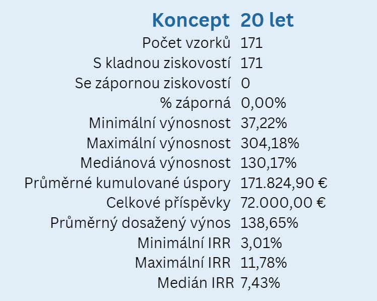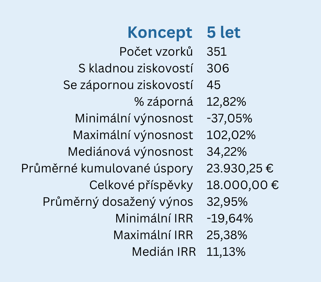 Z toho ve 45 případech je na konci pětiletého období záporný výsledek, tj. existuje 12,82% pravděpodobnost ztráty peněz v pětiletých obdobích.