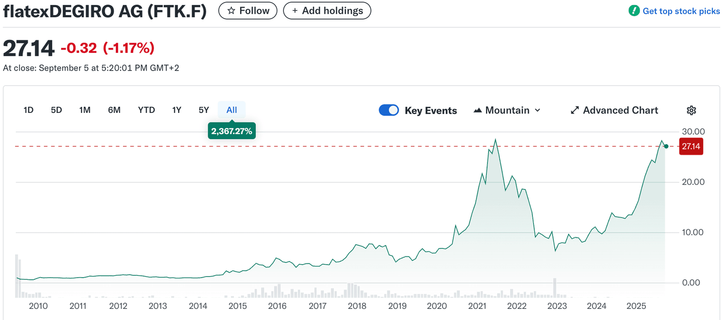FlatexAG je kótována na hlavním trhu německé burzy. Toto je její vývoj na burze od její kotace: