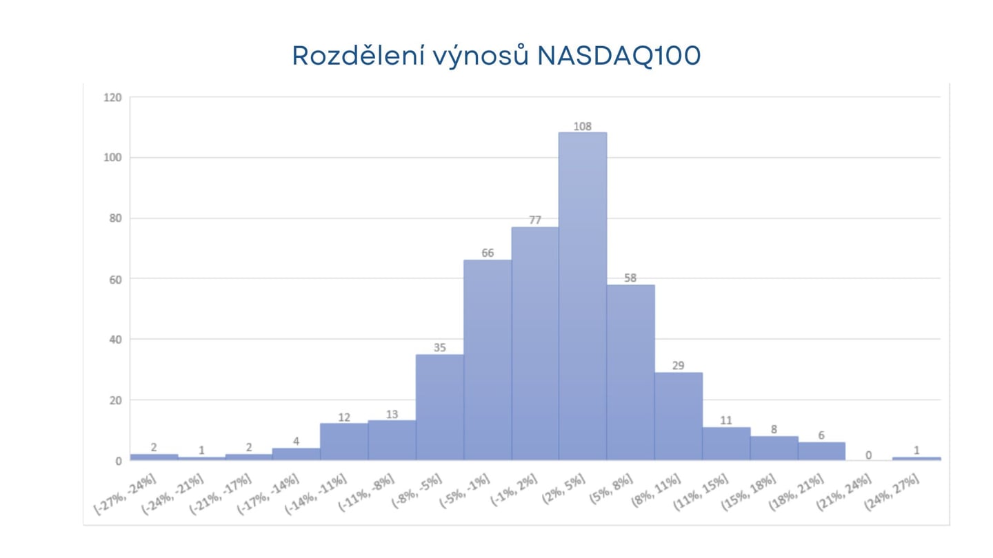 Následující graf ukazuje rozložení výnosů NASDAQ100 v měsíčních intervalech. To je velmi užitečné ze tří hlavních důvodů:
