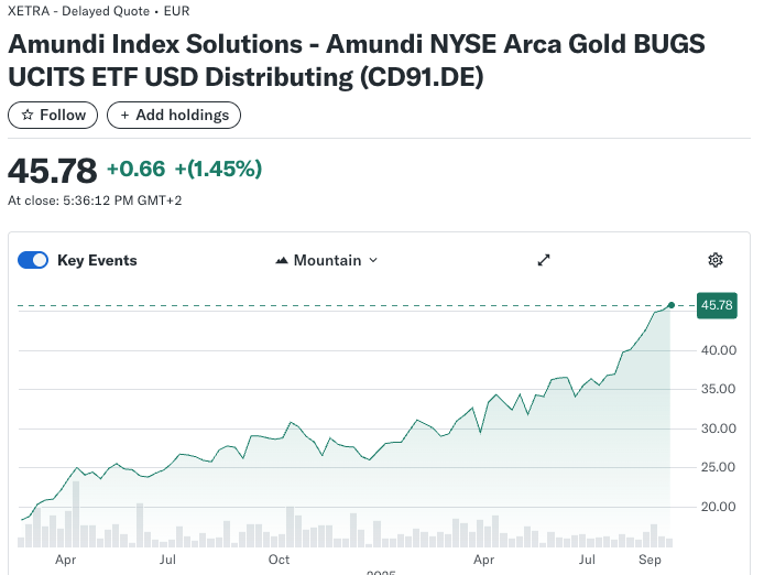 | Amundi NYSE Arca Gold Bugs UCITS ETF Dist | 0,65 % | 43.26 % | 34,58 % | CD91 | LU2611731824 |