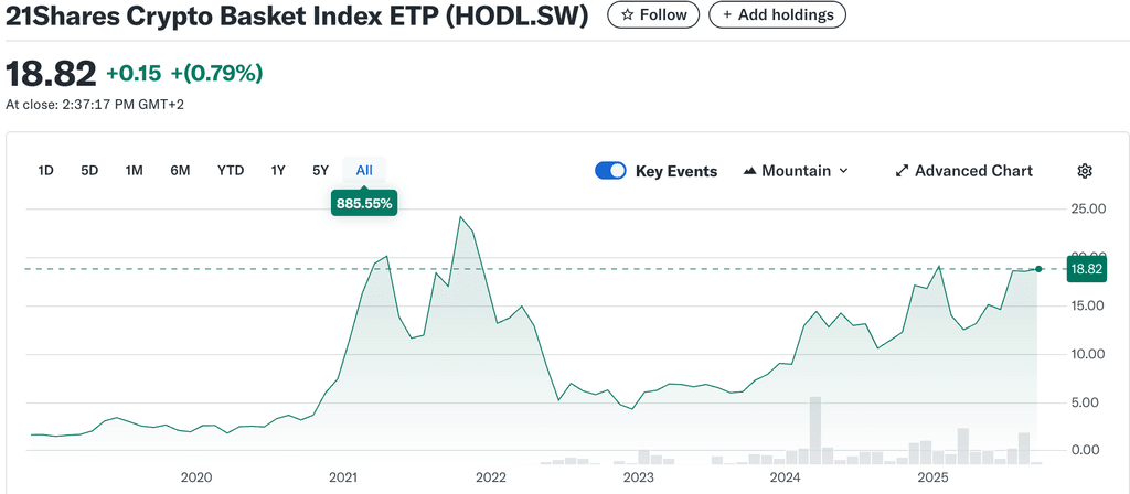 V tomto smyslu je 21Shares Crypto Basket Index investiční produkt, který nabízí diverzifikované portfolio několika kryptoměn. Je navržen tak, aby sledoval výkonnost indexu složeného z hlavních kryptoměn na základě tržní kapitalizace, což může být kombinace vedoucích kryptoměn jako Bitcoin (BTC) a Ethereum (ETH) a dalších. Váha každé kryptoměny v indexu je založena na její tržní kapitalizaci, což znamená, že kryptoměny s vyšší tržní hodnotou mají větší váhu v portfoliu. (Bitcoin tedy bude mít největší podíl, Etherum druhý největší podíl apod.)
