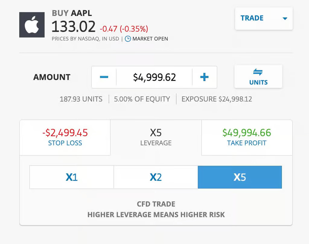 Operace s pákou jsou investiční strategie, které vám umožňují obchodovat s většími částkami peněz, než máte k dispozici, tím, že si část půjčíte od brokera (v tomto případě od eToro). Existují však různé předpisy, které chrání uživatele, protože páky vám mohou vydělat hodně, ale také hodně ztratit. Doporučujeme, abyste byli opatrní a nepoužívali příliš vysoké páky a neohrozili tak své portfolio.