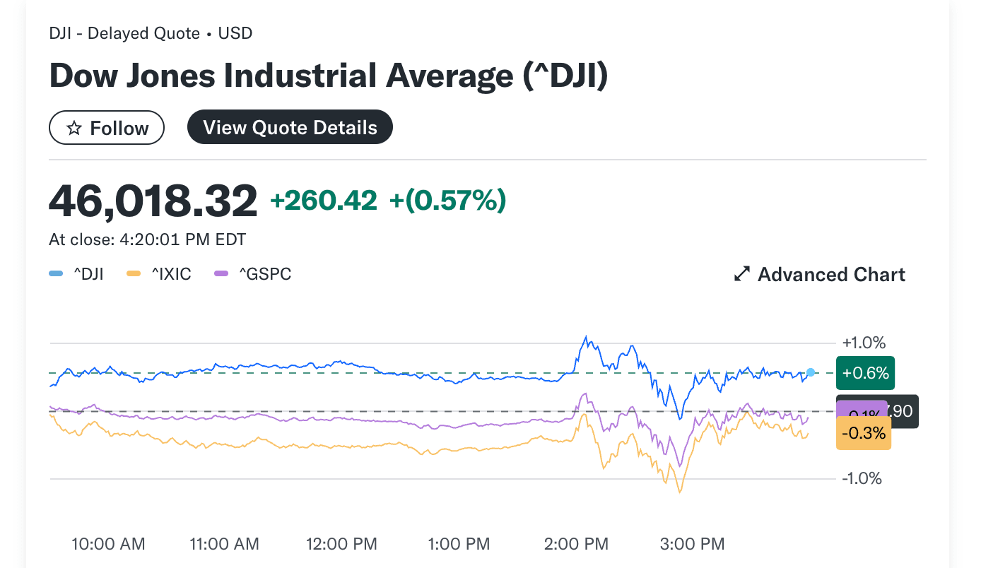 Index Dow Jones Industrial Average (^DJI) vzrostl o 0,5 %, zatímco S&P 500 (^GSPC) oslabil o 0,1 % a technologicky orientovaný Nasdaq Composite (^IXIC) klesl o 0,3 %.