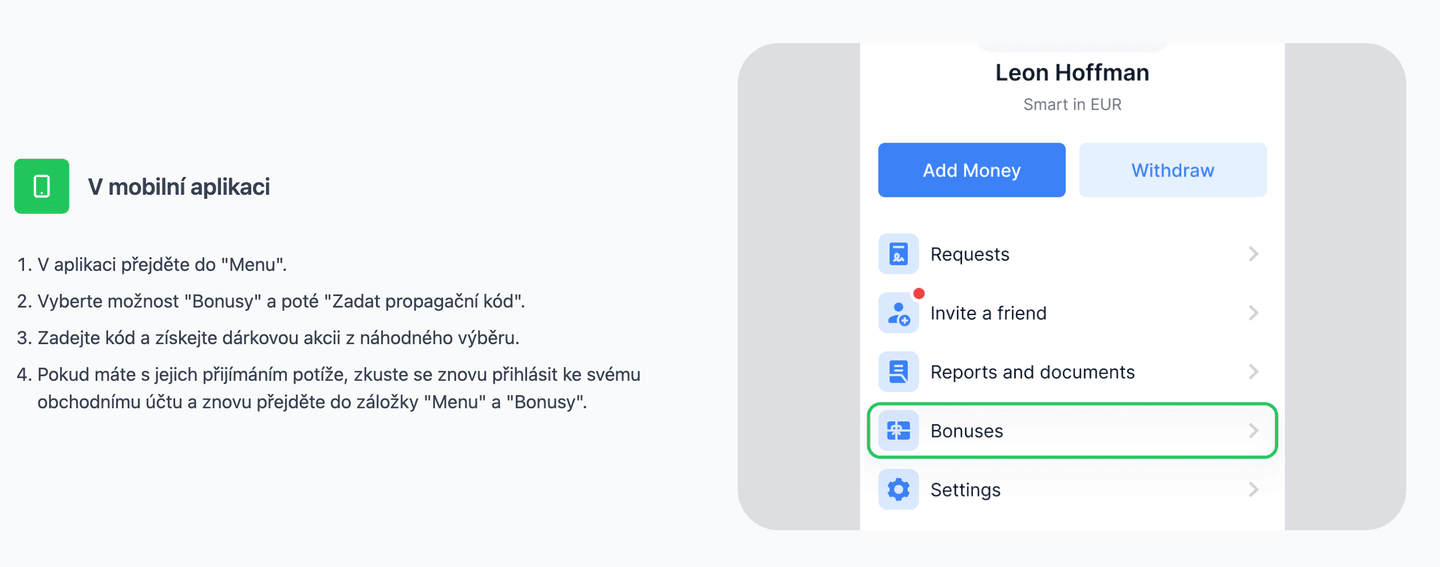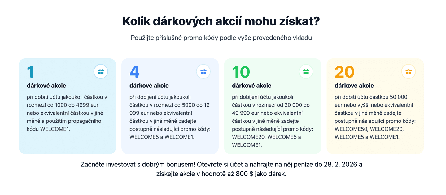 - 1 akcie jako dárek: Pro vklady mezi 1.000 a 4.999 eur (nebo ekvivalent v jiné měně). Je nutné použít promo kód WELCOME1.