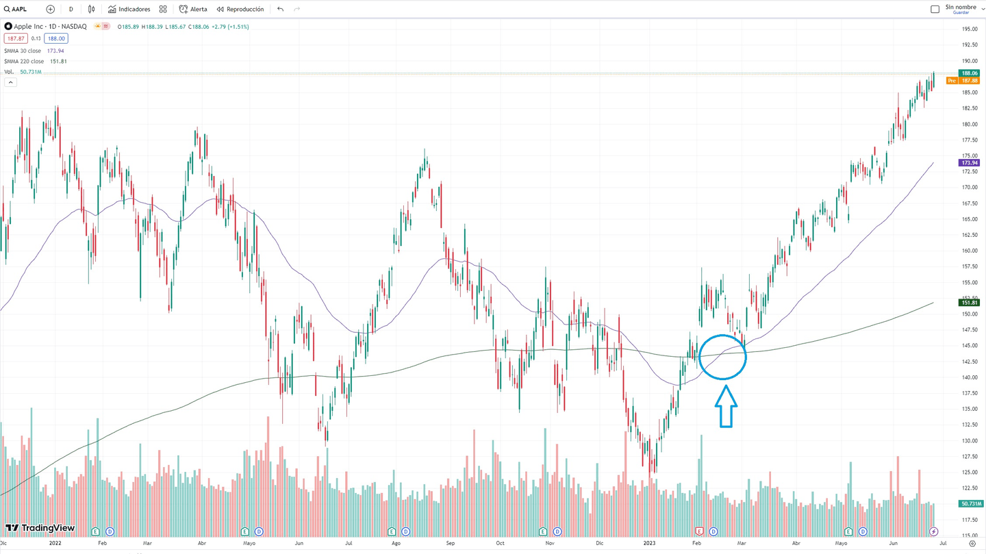 Podívejte se na graf níže pro akcii Apple, na svíčkách 1 den, jak klouzavý průměr 30 období (fialová čára) překřížil zespodu klouzavý průměr 200 období (zelená čára), což potvrdilo trend, který pokračoval v následujících měsících.