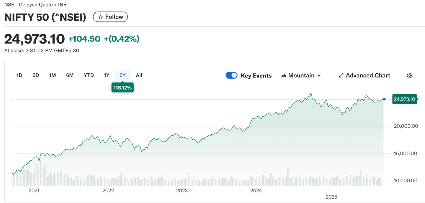 Indie je nyní čtvrtou největší ekonomikou světa podle nominálního HDP, s odhadem kolem 4,2 bilionu USD pro rok 2025. Kapitalizace indického akciového trhu přesahuje nyní 4 biliony USD, přičemž samotná NSE dosahuje přes 5 bilionů USD.