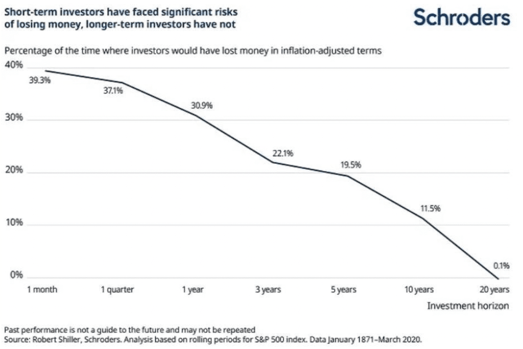 Čas omezuje riziko investic. A neříkám to já, ale různé studie. Tento graf od Schoders přesně shrnuje možnosti utrpět ztráty v akciích podle doby, po kterou zůstáváte investováni (a vše je upraveno o inflaci).