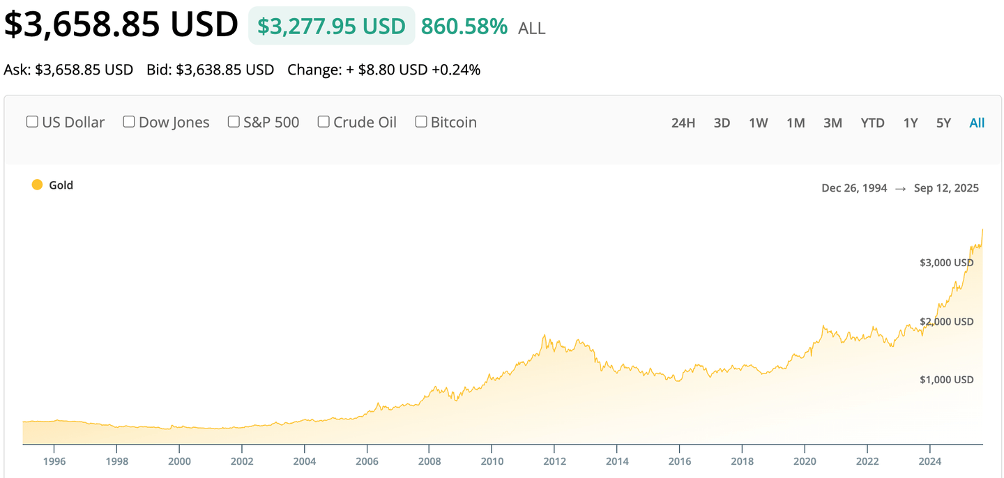 Tato trvanlivost spojená s nedostatkem tedy znamená, že nemůže být inflační, a proto slouží jako pojistka proti inflaci fiat měny. Není divu, že s přibývajícími lety cena unce zlata nepřestala růst (v přepočtu na fiat měnu; eura nebo dolary), což znamená nejen to, že zlato má větší hodnotu, ale i to, že fiat peníze mají menší hodnotu.