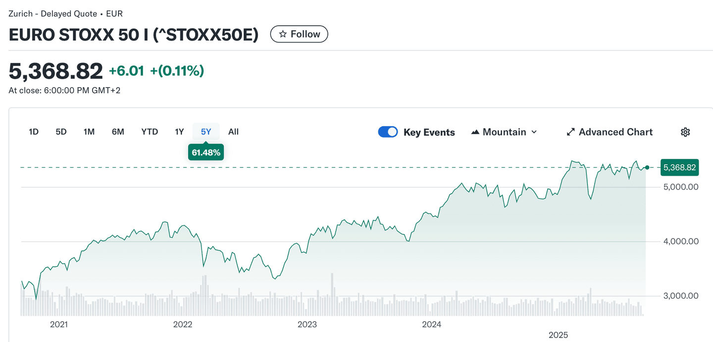 Od roku 1991 (referenčního bodu začínajícího na hodnotě 1000 bodů) až do konce roku 2024 index vzrostl z cca 1000 bodů (1991) na cca 4896 bodů v roce 2024, což představuje růst přes 389 %, tedy průměrný roční růst přibližně 5,8 %.- Na začátku roku 2025 index Euro Stoxx 50 překonal maximální hodnotu z března 2000 a dosáhl nového historického rekordu nad 5 464 bodů (intraden dosáhl až cca 5 522 bodů)