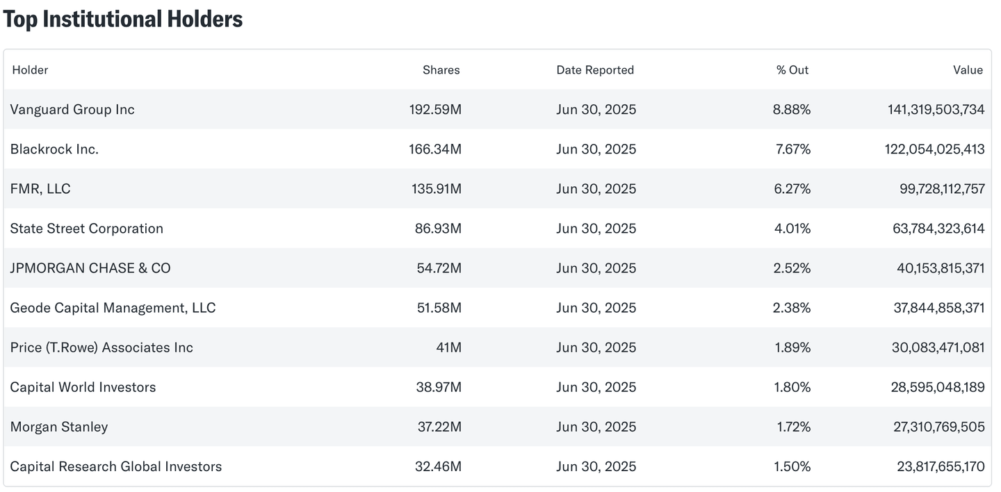 Další významné finanční instituce na seznamu hlavních akcionářů zahrnují FMR, LLC a Price (T. Rowe) Associates Inc, které také vlastní významné podíly.