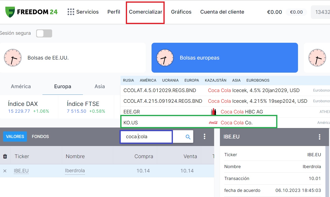Podívejme se nyní, jak investovat do akcií Coca-Cola, pomocí tohoto příkladu s Freedom24, jednoho z brokerů s největší hloubkou trhu, protože zahrnuje více než 40 000 světových akcií a až 800 000 opcí na americké akcie (mezi nimi samozřejmě nechybí Coca Cola):