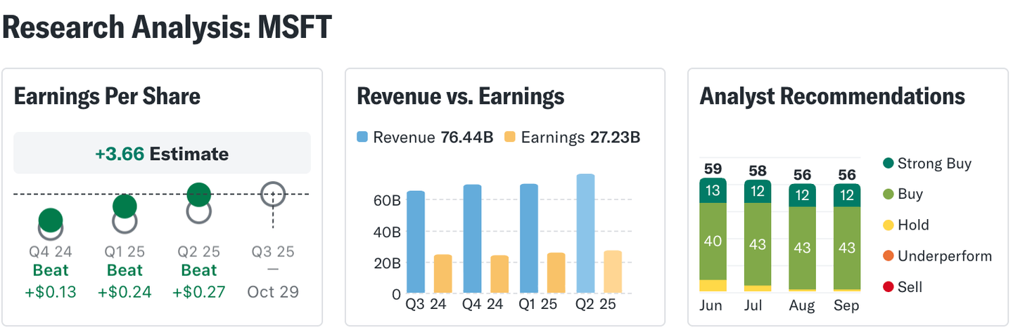 Analytici zůstávají nadále velmi pozitivní – v září 2025 akcii MSFT pokrývá 56 analytiků, z toho 12 doporučuje „Strong Buy“ a dalších 43 hodnotí jako „Buy“. Výrazné je také to, že již několik měsíců v řadě se neobjevila žádná doporučení k prodeji. To naznačuje vysokou důvěru investorů v dlouhodobý růstový potenciál Microsoftu, ať už v oblasti cloudu (Azure), produktivity (Microsoft 365) nebo AI (např. prostřednictvím investice do OpenAI). Microsoft tak i nadále patří mezi nejstabilnější a nejvýnosnější technologické tituly na trhu.