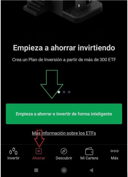 Jakmile jsme otevřeli účet u brokera, první věc, kterou musíme udělat, je jít do mobilní aplikace, sekce spoření, abyste mohli začít vytvářet XTB investiční plán (jak je uvedeno na prvním snímku obrazovky).