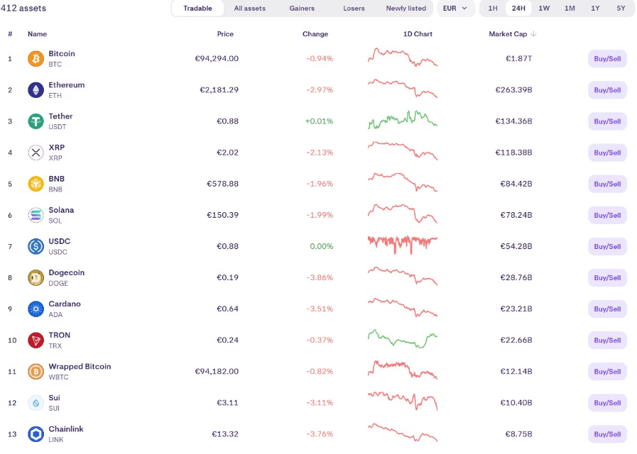 Jak je vidět níže, platforma zahrnuje také některé z největších kryptoměn podle tržní kapitalizace, jako jsou Bitcoin, Ethereum, Cardano a mnoho dalších.