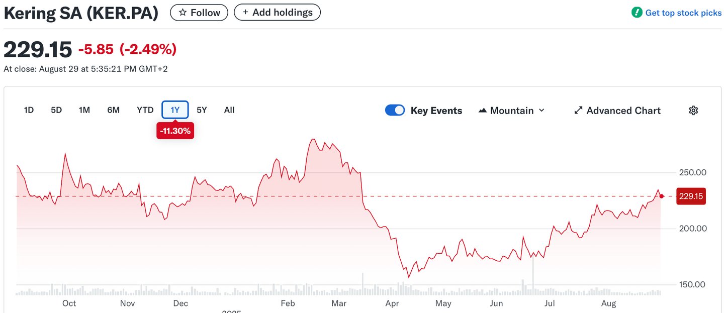 Kering vlastní prestižní módní domy jako Gucci, Saint Laurent, Balenciaga a Bottega Veneta, čímž si drží silnou pozici na trhu luxusní módy. Společnost však v posledním roce čelila poklesu tržeb (zejména v Číně), což vedlo k výraznému oslabení ceny akcií, jak můžeme vidět na následujícím grafu: