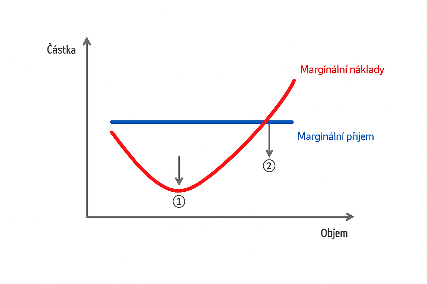 Jak můžeme vidět na dolním grafu, existuje bod, kde se kříží mezní náklady s mezním příjmem. Ten je roven ceně.