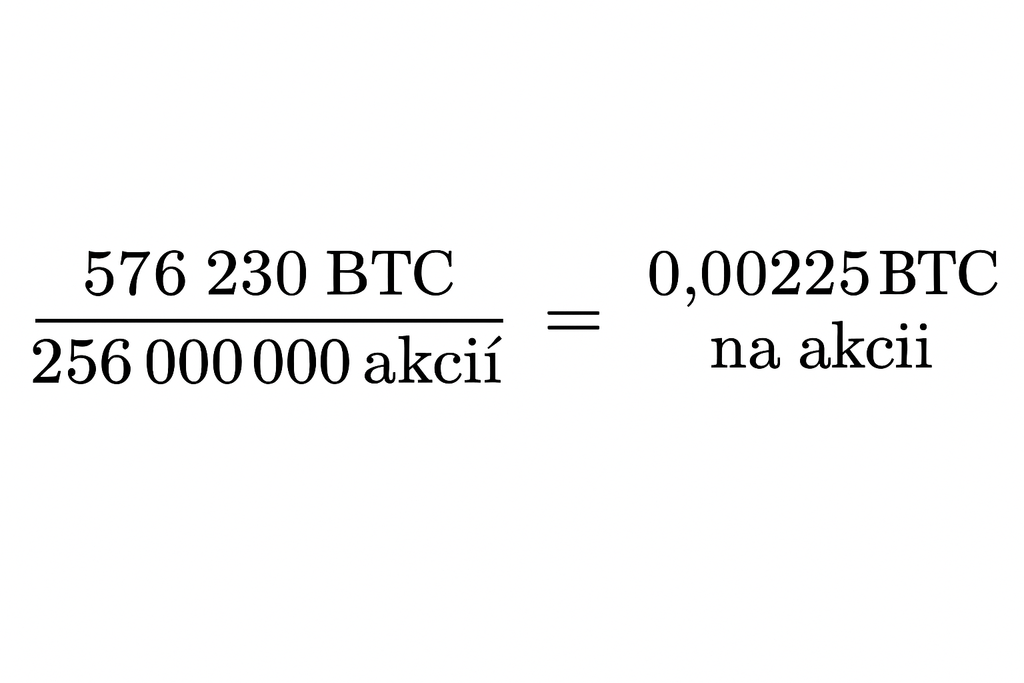 K květnu 2025 připadá na jednu akcii MSTR přibližně 0,00225 BTC*, což při přepočtu na „paritu“ s Bitcoinem odpovídá hodnotě 240 USD. Tržní cena akcie je však kolem 399 USD, tedy s prémií přibližně 68 %, která odráží provozní páku díky držení Bitcoinu v rezervách namísto fiat měny.