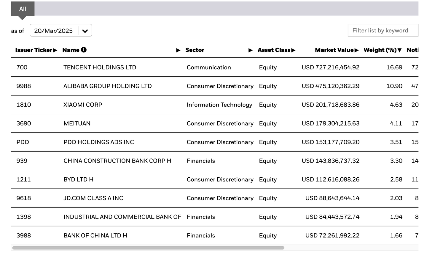 ETF sleduje index MSCI China, který má v portfoliu středně a velkokapitalizované společnosti s akciemi A, H, B, Red chips a čínskými ADR.