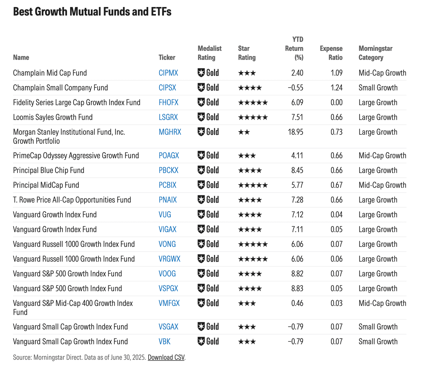 Pokud hledáte fondy zaměřené na růstové akcie (tzv. growth funds), aktuální data z Morningstaru (červen 2025) ukazují, že americký trh zůstává v tomto segmentu velmi silný. V žebříčku nejvýkonnějších růstových fondů se objevují jak fondy s velkou kapitalizací (Large Growth), tak i fondy zaměřené na mid-cap a small-cap společnosti.