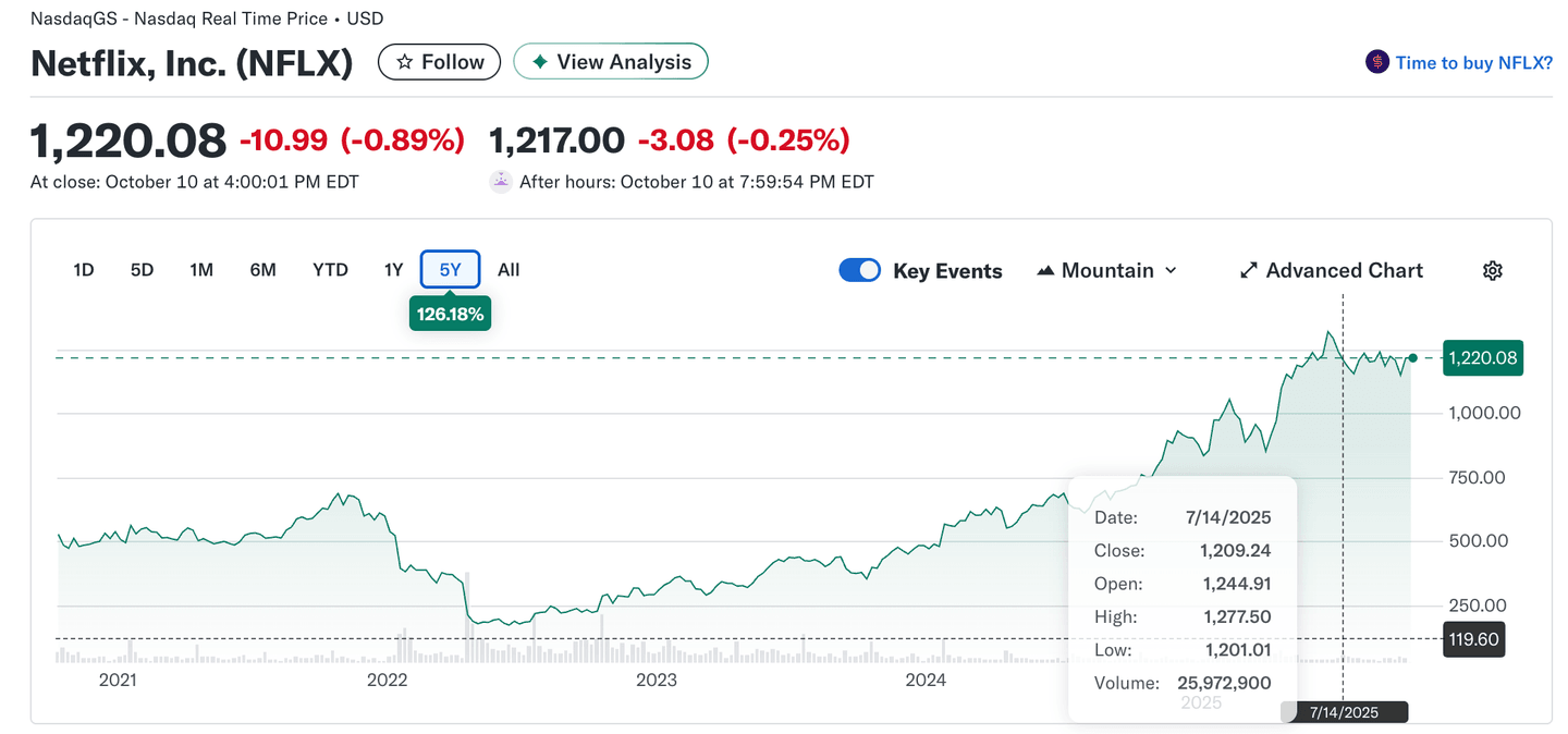 K 10. říjnu 2025 se akcie Netflix (NFLX) obchodují za 1 220,08 USD. To představuje nárůst o více než 126 % za pětileté období. Zatímco v roce 2022 akcie prudce klesly v reakci na zpomalení růstu předplatitelů a obavy z konkurence, od poloviny roku 2023 sledujeme stabilní oživení. Společnost postupně upravila obchodní model, zavedla reklamní verzi předplatného a rozšířila nabídku v nových regionech, což přineslo pozitivní dopady na tržby i zisky. Výrazný růst nastal zejména v roce 2025, kdy firma pravidelně překonává očekávání analytiků.