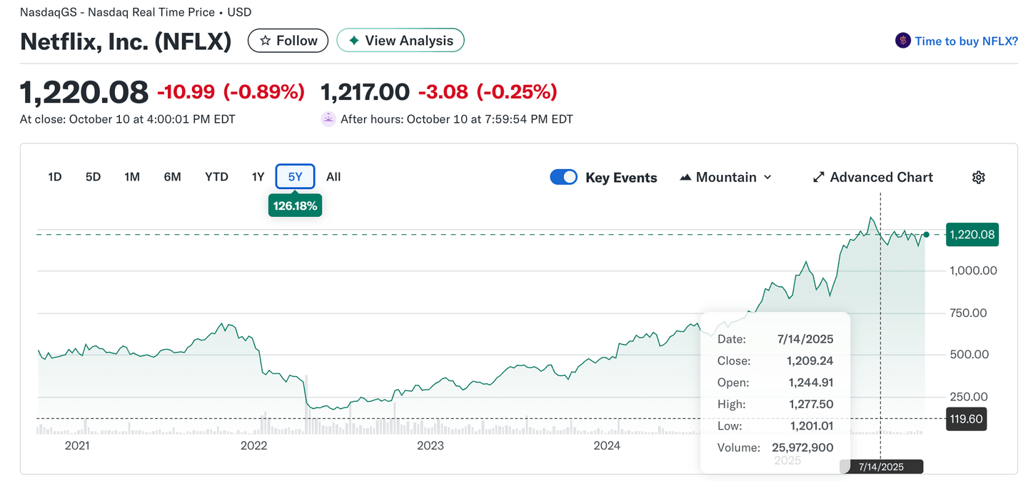 K 10. říjnu 2025 se akcie Netflix (NFLX) obchodují za 1 220,08 USD. To představuje nárůst o více než 126 % za pětileté období. Zatímco v roce 2022 akcie prudce klesly v reakci na zpomalení růstu předplatitelů a obavy z konkurence, od poloviny roku 2023 sledujeme stabilní oživení. Společnost postupně upravila obchodní model, zavedla reklamní verzi předplatného a rozšířila nabídku v nových regionech, což přineslo pozitivní dopady na tržby i zisky. Výrazný růst nastal zejména v roce 2025, kdy firma pravidelně překonává očekávání analytiků.