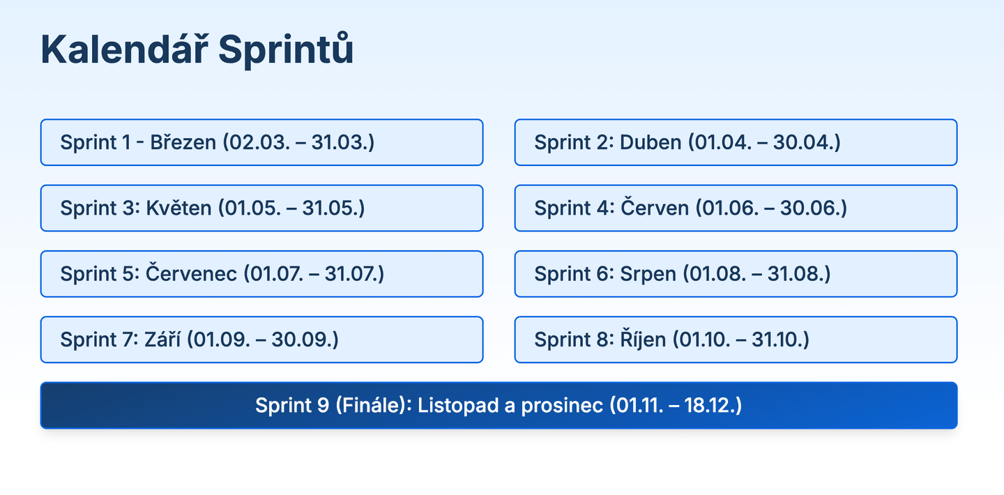 Probíhá 9 měsíčních sprintů od března do prosince.