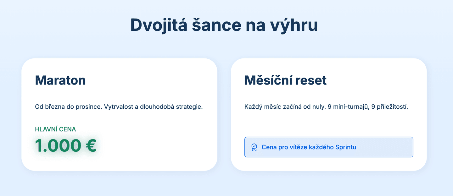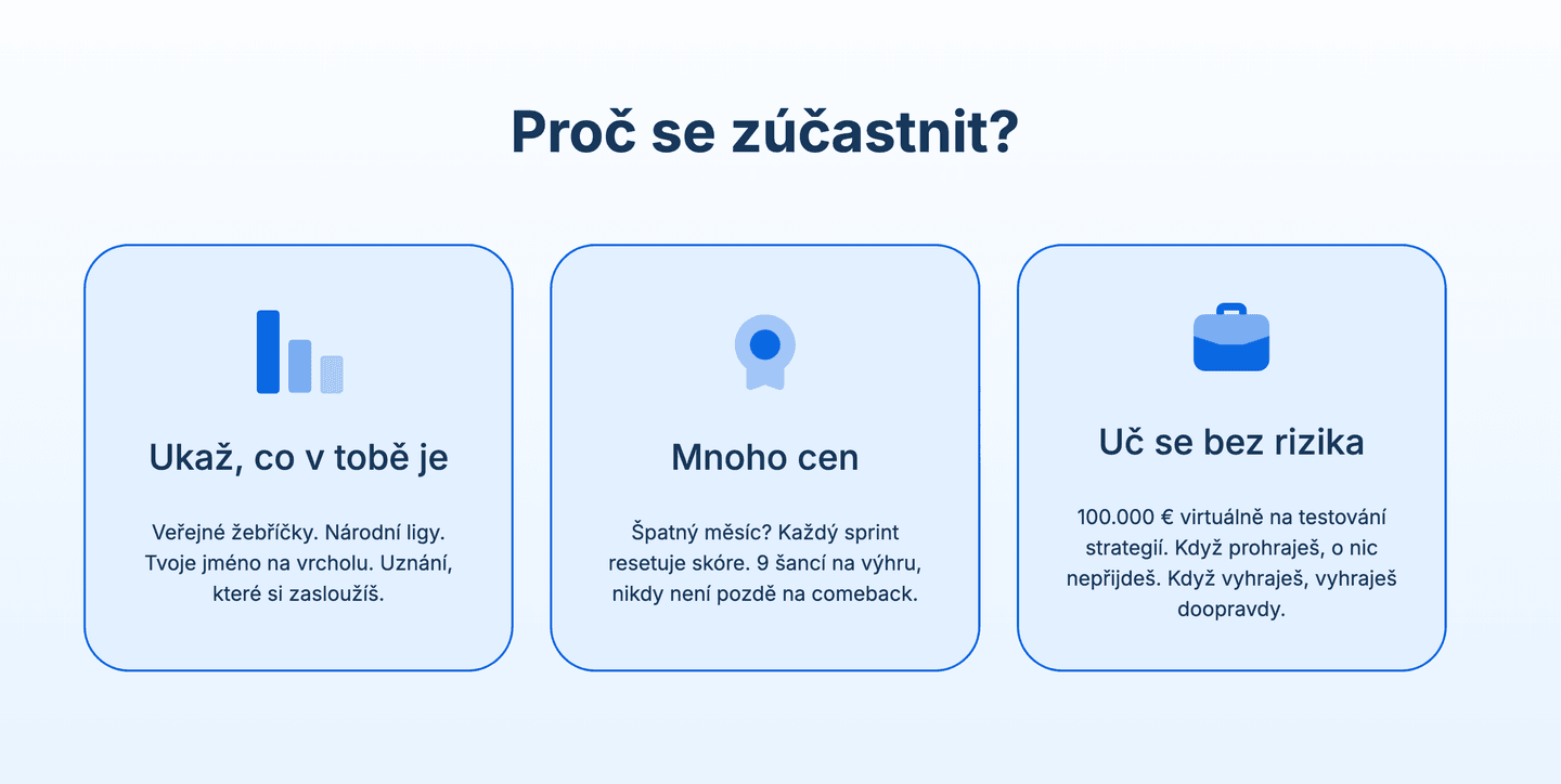 Cílem není „sázet“ ani agresivně obchodovat, ale prokázat schopnost konzistentně spravovat portfolio v čase. Hodnotí se nejen výnosnost, ale také řízení rizika a stabilita strategie.
