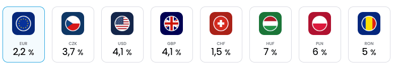 Výše úročení neinvestovaného kapitálu se odvájí od zvolené měny: