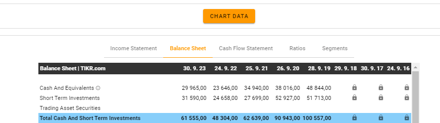 Dlouhodobé závazky TIKR neuvádí, ale výpočet je velmi jednoduchý. Dlouhodobé závazky = celkové závazky - celkové krátkodobé závazky.