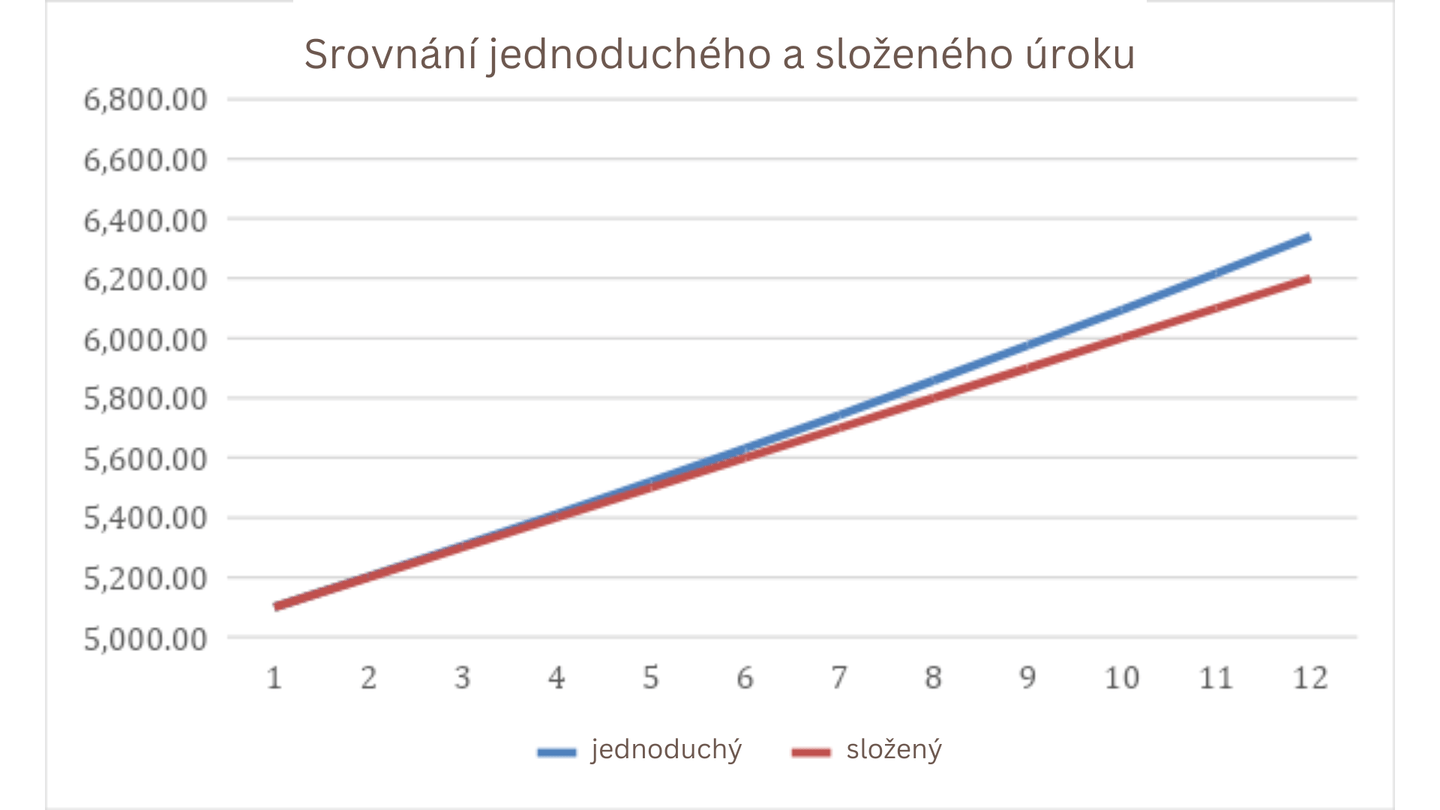 Pokud bychom naopak úrok neinvestovali (prostý úrok), výsledek by byl 6 200 Kč.