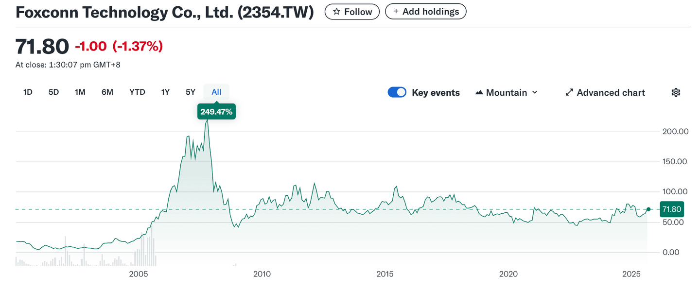Foxconn je největší výrobce elektronických komponentů na světě a největší exportér Tchaj-wanu. Jeho seznam klientů zahrnuje společnosti jako Apple, Sony nebo Microsoft. V roce 2023 dosáhl obratu více než 6 miliard dolarů.