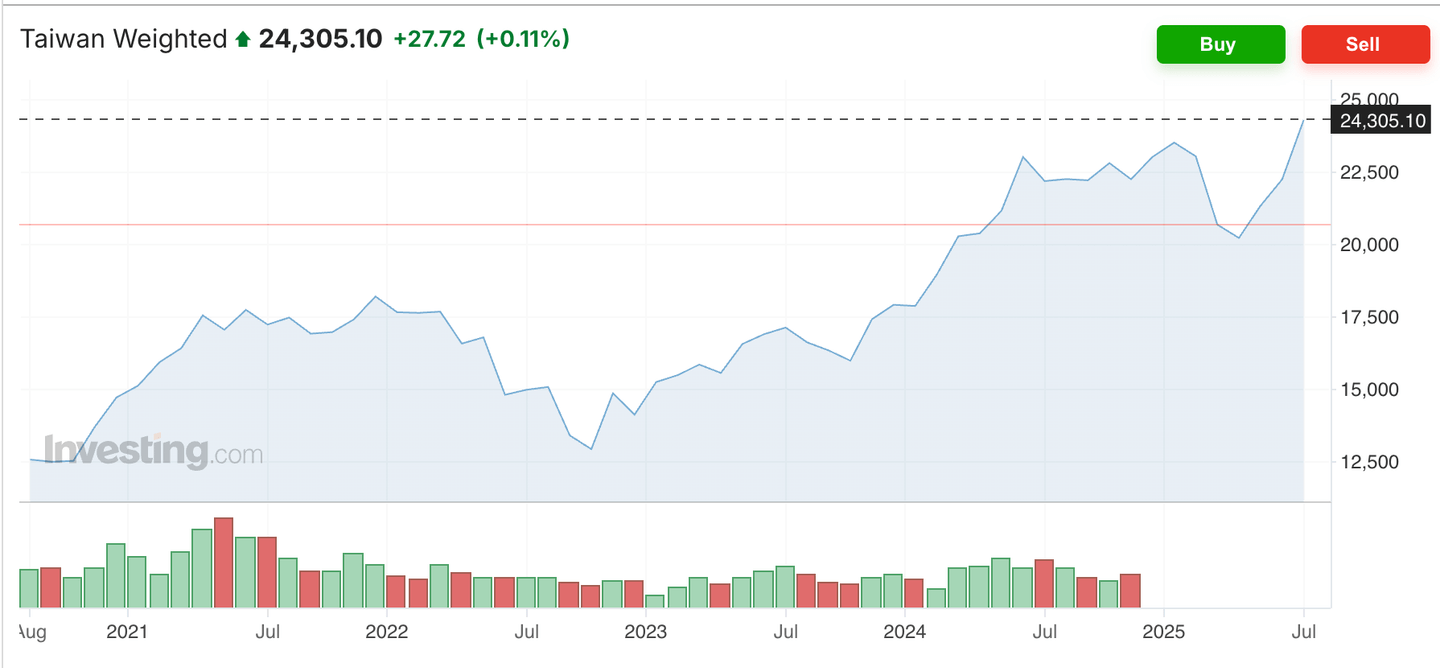 Akciový index TAIEX (TWII) dosáhl v létě historického maxima kolem 24 480 bodů. Přestože se objevily obavy z amerických cel i ochlazující se euforie kolem umělé inteligence, trh zůstává silný.
